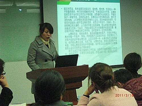 優秀市場部經理陶玲為新員工分享“如何贏得客戶”的營銷培訓